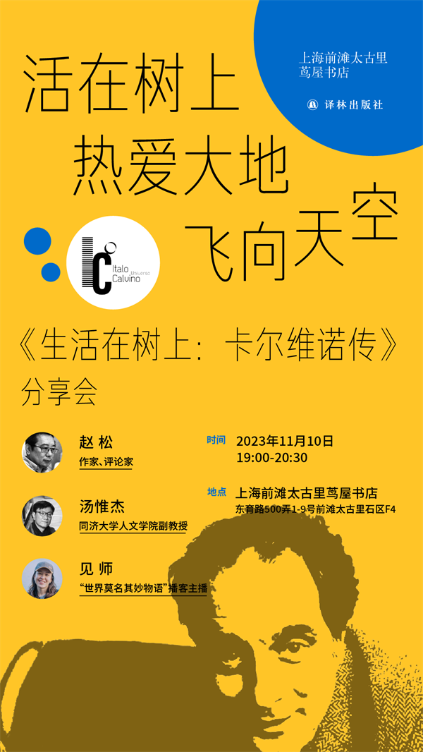 这是一份知识分子的传记,更是卡尔维诺如何“成为卡尔维诺”的故事。11月10日晚,来前滩太古里茑屋书店,和作家、评论家赵松,同济大学人文学院副教授汤惟杰,“世界莫名其妙物语”播客主播见师共读《生活在树上:卡尔维诺传》,“活在树上-热爱大地-飞向天空”,度过一段美妙难忘的、专属于卡尔维诺及其拥趸的文学时光。