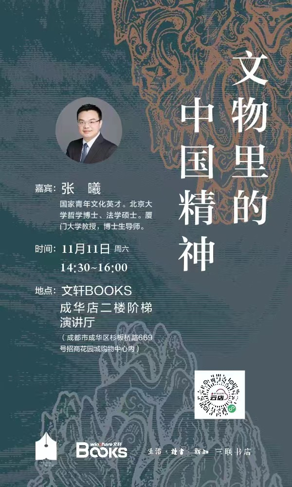 11月11日,我们邀请到厦门大学教授、博士生导师张曦做客文轩BOOKS成华店,分享《观念的形状:文物里的中国哲学》。张曦教授会撷取中国思想长河中的几个片段,与现场观众一起分享来自古代先哲的智慧。