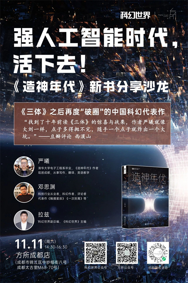 奇点何时出现?人工智能的革命从哪里开始突破?11月11日,《造神年代》新书分享沙龙将在方所成都店举行。《造神年代》作者严曦,科幻作者、评论者邓思渊,科幻世界杂志社副总编、《科幻世界》主编拉兹,将探讨如何在“强人工智能时代,活下去”。