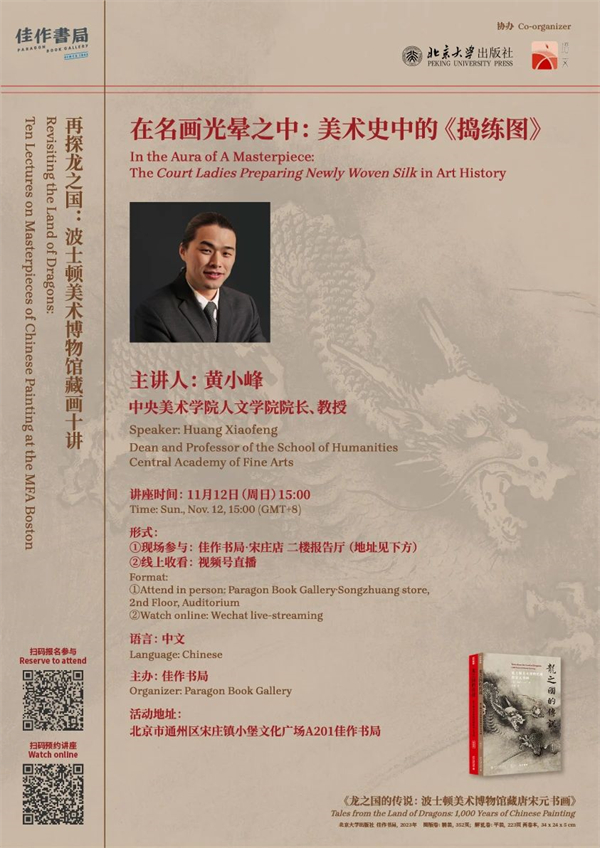 伴随波士顿美术博物馆经典书画图录《龙之国的传说:波士顿美术博物馆藏唐宋元书画》的出版,11月12日下午,“再探龙之国”系列第八讲将邀请中央美术学院人文学院院长黄小峰教授做客佳作书局·宋庄店,为大家介绍波士顿美术博物馆所藏传宋徽宗摹唐代张萱《捣练图》及相关问题。这幅作品是一件影响深远的名作,海内外诸多学者对此画进行了深入讨论,但仍有一些问题有待反复思考。作为一件时代相对明确的北宋绘画,《捣练图》在美术史中却多被置于唐代艺术的篇章中来论述。回归历史语境,我们该如何看待这件杰作?本次演讲将在已有学术研究基础上,对《捣练图》的流传过程和图像问题做详细的考察。