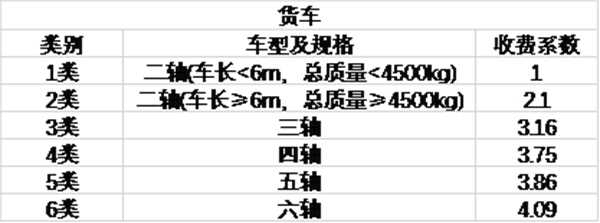 (2)货车由原先的按额定质量分类,调整为按车辆总轴数、车长和总质量等进行分类,原来只有5类车型调整为6类车型。