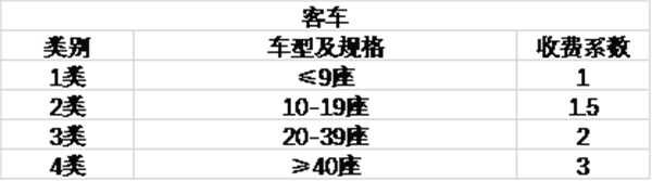 (1)客车车型仍按照座位数分成4类,车长小于6米的8座和9座小型客车,由原来的2类车调整为1类车。备注:普通家用5座或7座轿车也属于1类客车,因此它的收费系数为1。