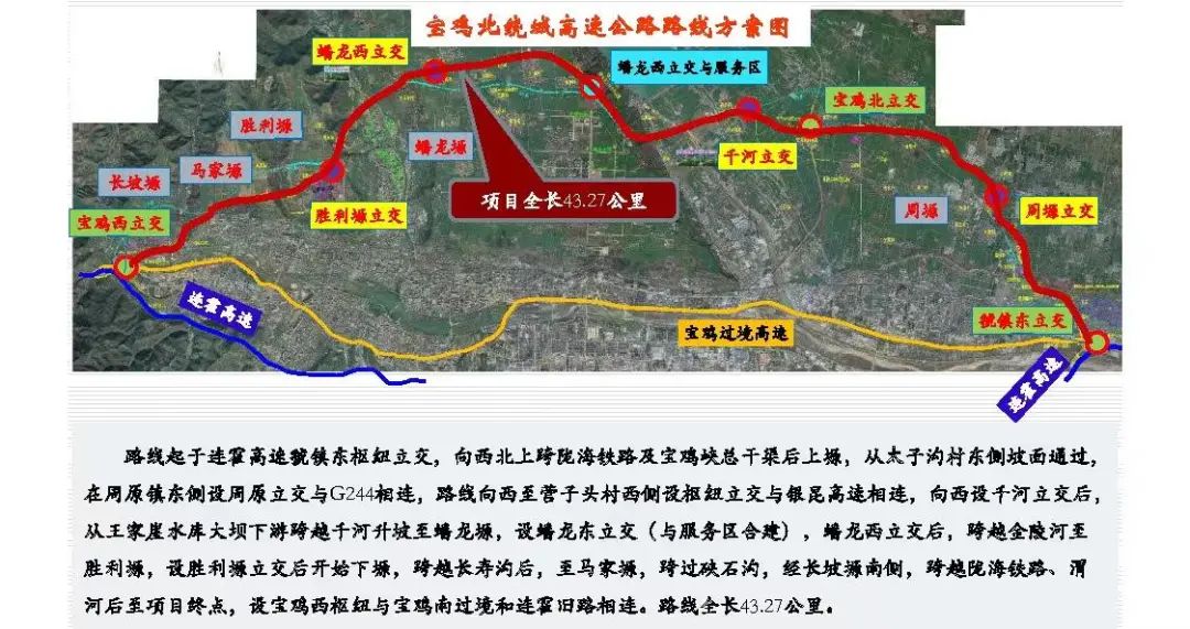 东起连霍高速虢镇东枢纽,向西北设线,经陈仓区周原镇、千河镇,金台区蟠龙镇、金河镇,在马家塬折向南跨越渭河,与连霍高速宝鸡西枢纽立交相接,路线全长43公里。
