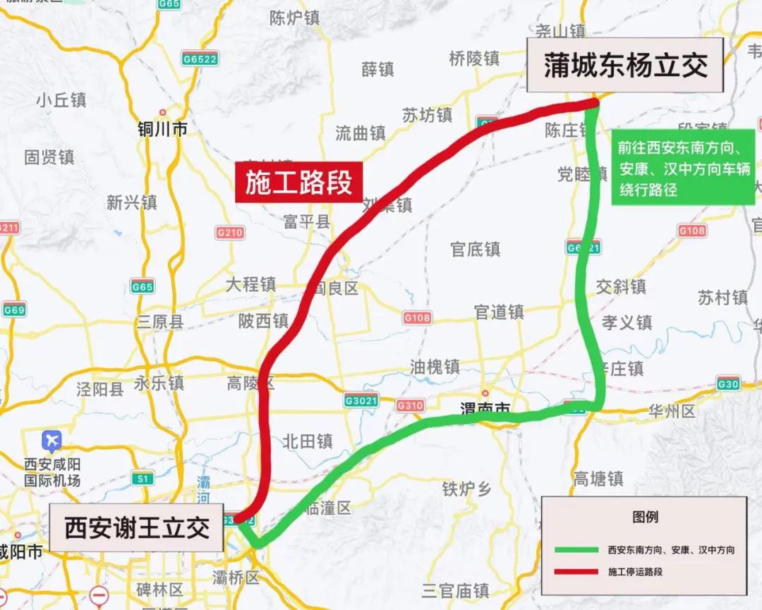 去往西安东南方向、安康、汉中方向由东杨枢纽立交绕行榆蓝高速,经赤水枢纽立交至连霍高速,经方家村枢纽立交至西安绕城高速,或由东杨枢纽立交绕行榆蓝高速,经玉山枢纽立交至沪陕高速,经田王枢纽立交至西安绕城高速;