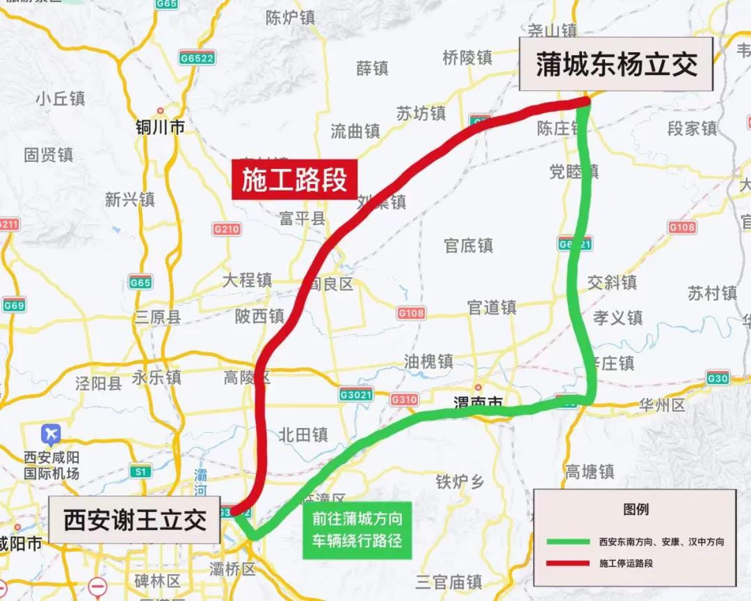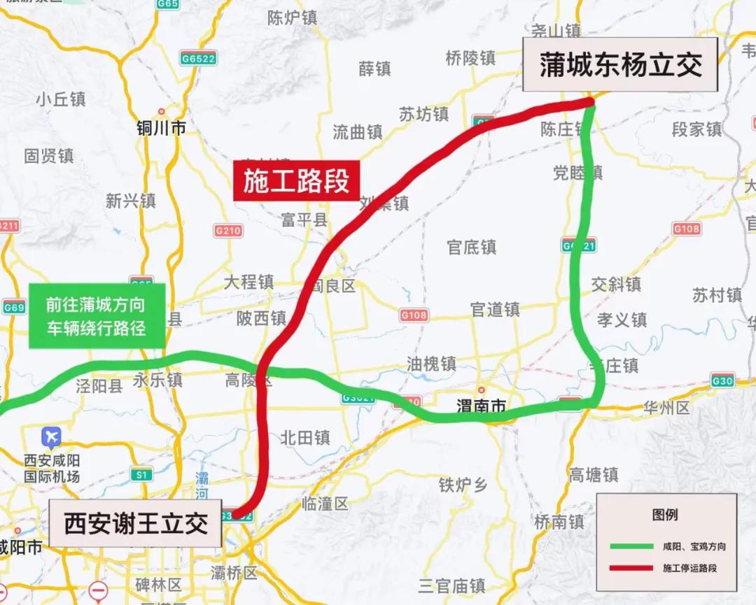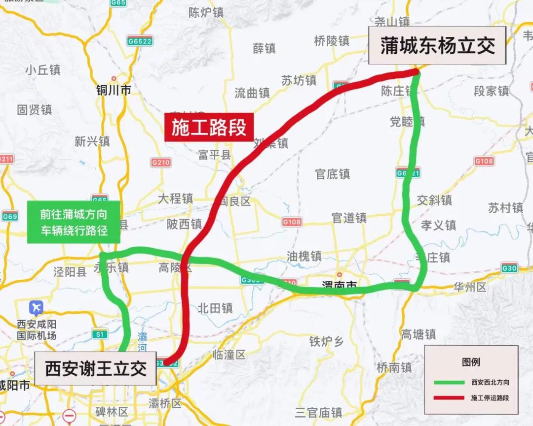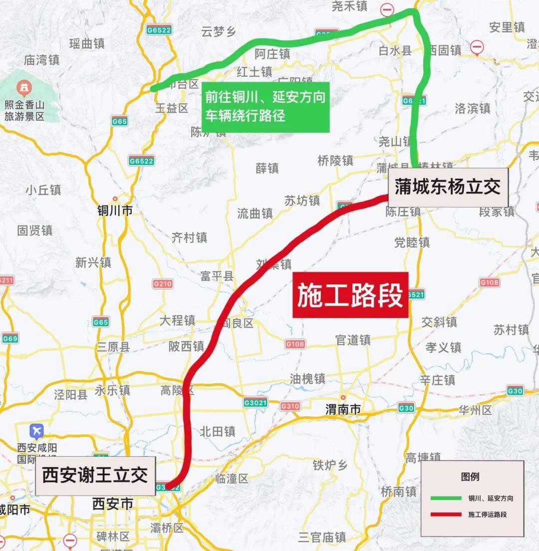 去往荆姚、蒲城方向车辆行驶G108,去往韩城、山西方向由蒲城东立交行驶榆蓝高速,经东杨枢纽立交转京昆高速(蒲城至禹门口段);