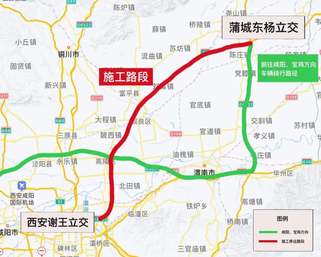 去往咸阳、宝鸡方向车辆由东杨枢纽立交绕行榆蓝高速,经赤水枢纽立交至连霍高速,经零口枢纽立交至临兴高速;