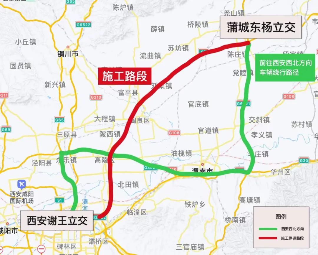 施工期间,将封闭西安外环高速公路高陵北枢纽立交进入京昆高速双向匝道及蒲城、荆姚、富平、阎良、高陵、港务区收费站,途经车辆须提前择路绕行。