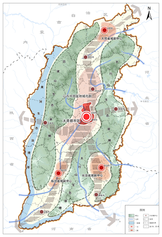 山西省构建了以“一主三副六市域中心”为主体的国土空间开发利用格局。“一主”:即太原都市区,是带动全省创新驱动、转型升级的核心引擎,打造成为山西省参与国际国内竞争、带动全省社会经济和城镇化发展的核心地区。“三副”:即大同、长治和临汾三个省域副中心,是山西省次区域经济发展的核心区,也是山西省开放对接、融入国家战略区域的重要门户和载体。“六市域中心”:即运城、晋城、阳泉、朔州、忻州、吕梁六个市域中心,是全省重要的增长极。