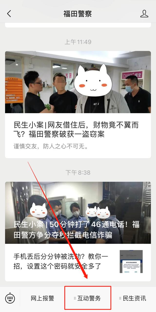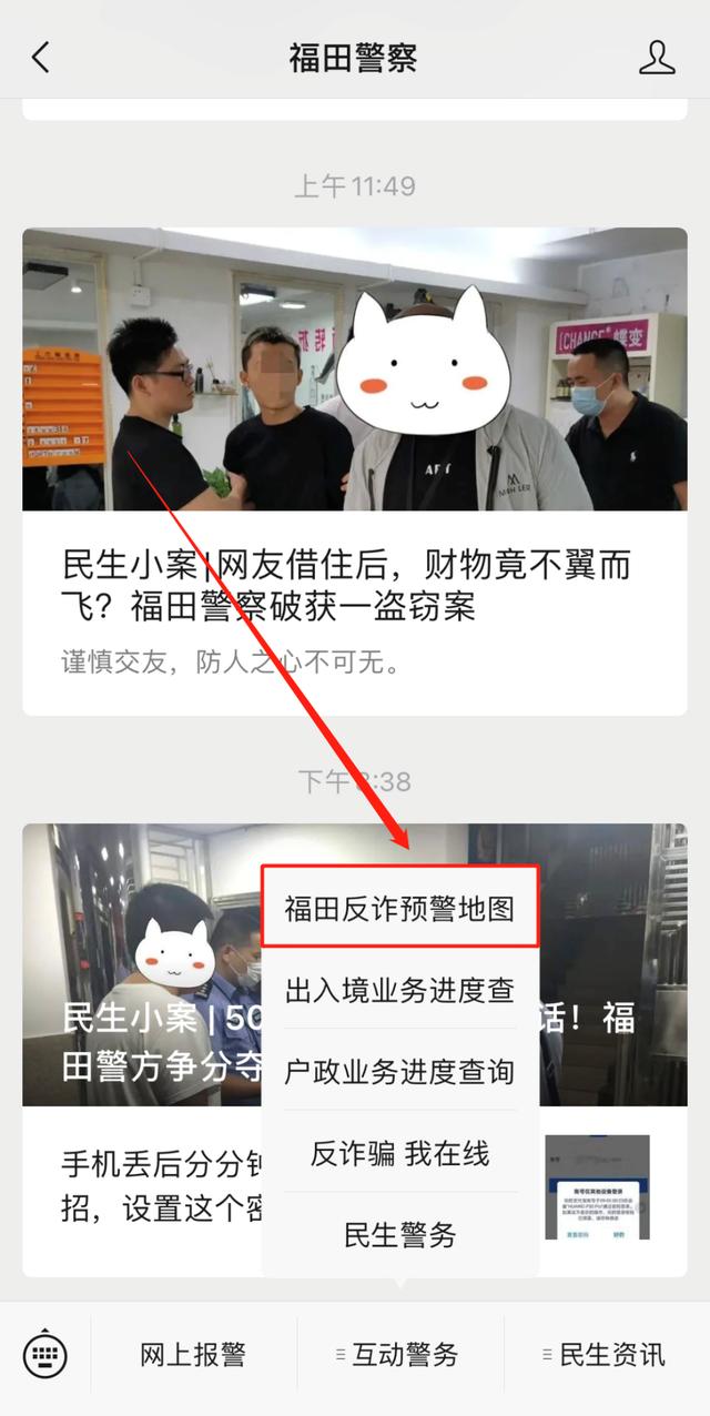 ❖ 1.从“福田警察”微信公众号“互动警务”菜单栏,选择“福田反诈预警地图”子菜单,进入“福田反诈预警地图”。