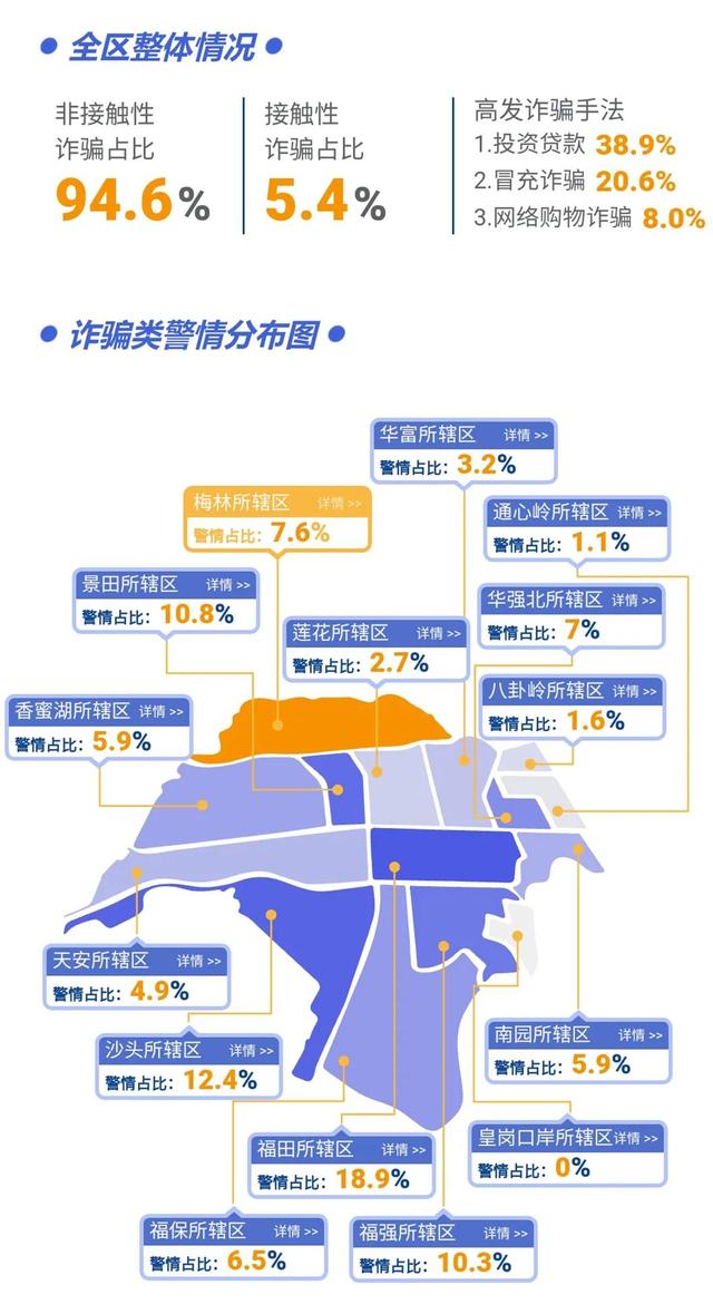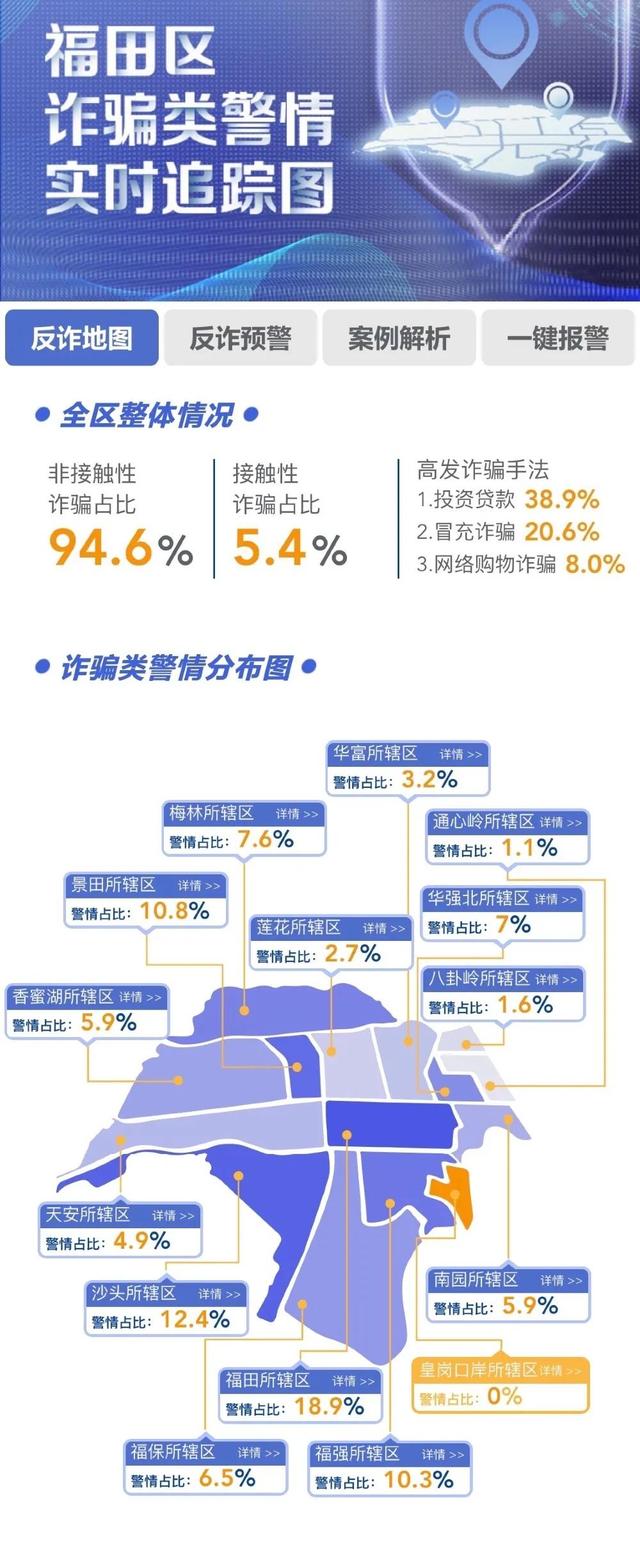 在“反诈地图”模块,直观呈现了诈骗警情,例举的三项是福田区非接触性诈骗和接触性诈骗案情占比,以及最新多发诈骗类型。可以看到,10月24日至30日,多发诈骗类型为投资贷款,发案率占比达到38.9%,值得引起市民警惕;依次往下,冒充和网络购物诈骗占比分别20.6%和8%,随着“双十一”电商节临近,市民网购数量激增,青年、学生、家长、上班族等人群需提高警惕,尤其注意网购类诈骗。