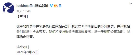 随后,瑞幸咖啡官微发表声明:瑞幸咖啡尊重并坚决执行国家相关部门就此次调查所做出的处罚决定,并已就相关问题进行全面整改。我们将按照相关法律法规要求,进一步规范经营活动,保障稳定运营。