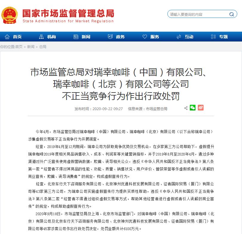 据公开信息,9月18日,市场监管总局及上海、北京市场监管部门,对瑞幸咖啡(中国)有限公司、瑞幸咖啡(北京)有限公司及北京车行天下咨询服务有限公司、北京神州优通科技发展有限公司、征者国际贸易(厦门)有限公司等45家涉案公司作出行政处罚决定,处罚金额共计6100万元。