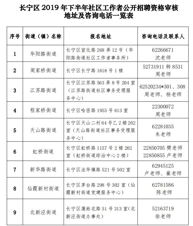 达到笔试合格分数线的考生须自行前往报考岗位所属街镇参加现场资格审核,资格审核的时间为2019年10月24日至10月25日(上午9:00-11:00,下午13:00-16:00)。具体地址详见下表。