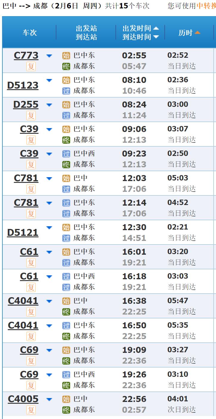 2月6至9日加开巴中东至成都东C773次,巴中东02:55开,成都东05:47到,沿途停靠遂宁站,全程用时2小时52分。