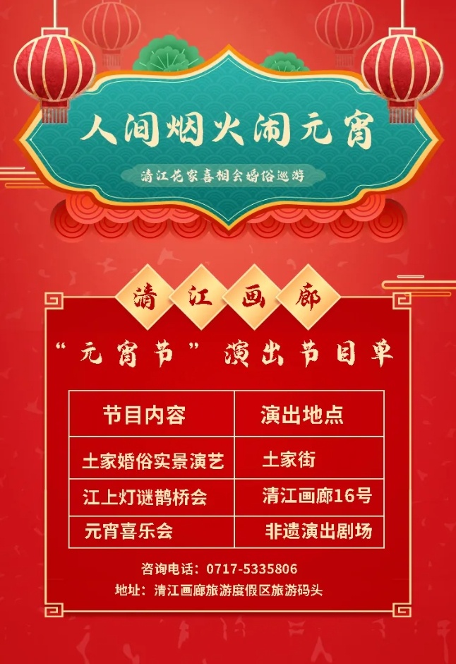 正月十五19:30-20:30,儿童公园灯会主舞台,举办“非遗璀璨,共贺新春”非遗节目展演,包括舞蹈、声乐、曲艺等门类的节目共10个。节目单如下:①开场舞蹈《清江春潮》;②男声独唱《卡普就是一朵花》;③舞蹈《姑娘心意你莫推》;④女声独唱《西兰卡普》 ;⑤渔鼓说唱;⑥舞蹈《巴期不得》;⑦男生独唱《喊山歌》;⑧长阳南曲《岁月静好人风流》;⑨土家打溜子与竹笛《欢乐土家寨》;⑩尾声歌舞《山歌好比清江水》。