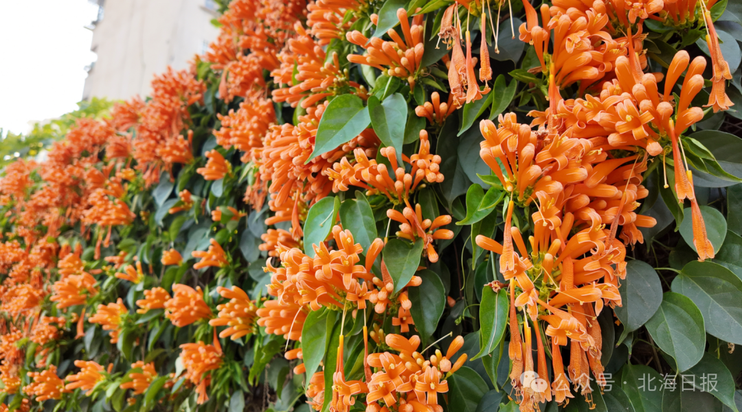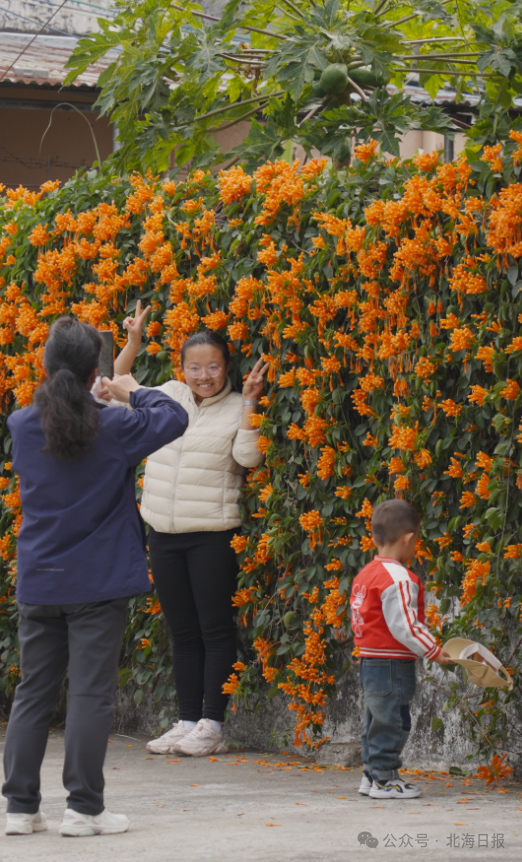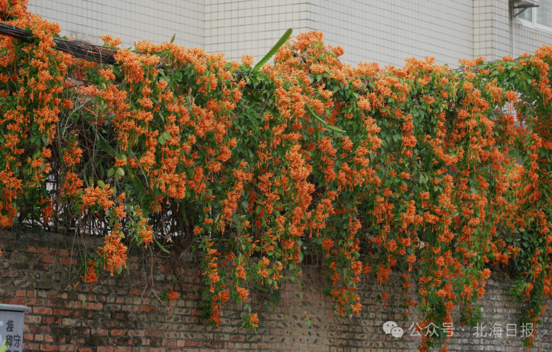 大地回春,北海云南路、嘉华路等街道的炮仗花应景盛开。喜庆的颜色挂满枝头,密密匝匝从围墙倾泻而下,像极了报喜的鞭炮,煞是惹眼。炮仗花在暖阳下绽放,让角角落落的氛围感直接拉满。路过的市民纷纷拿出手机,拍下这喜庆气氛。