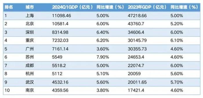 GDP总量十强城市依次为:上海、北京、深圳、重庆、广州、苏州、成都、杭州、武汉、南京。这一排序与去年同期相比有较大变化,但与去年的年度排名几乎完全一致。这主要是因为,去年一季度是新冠疫情防控全面放开后的第一个完整季度,各地经济社会生活恢复进度不一,不能真实反映各地的综合经济实力。