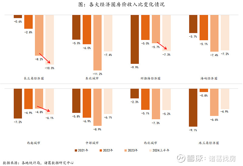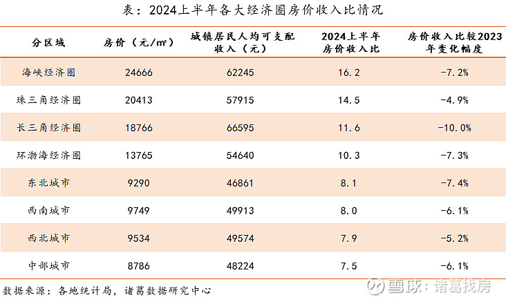 3、2024上半年八大经济圈房价收入比继续呈现下滑态势。其中,长三角降幅位居八大经济圈首位,海峡经济圈、东北城市等多数区域降幅呈收窄态势。