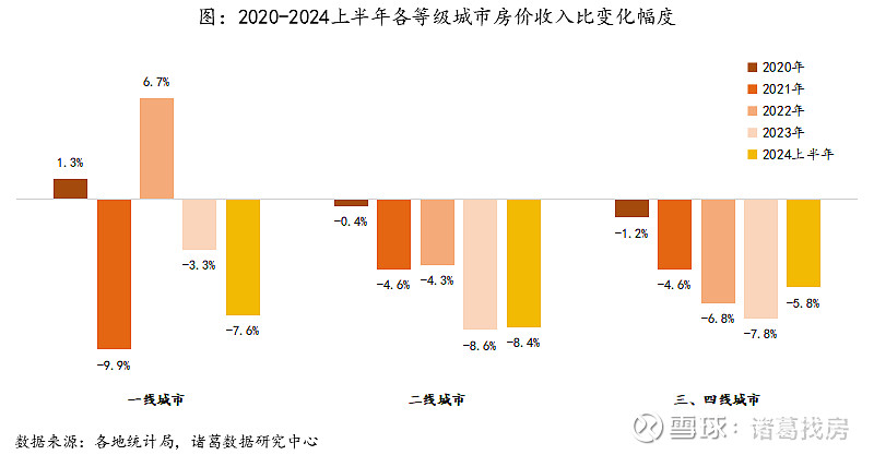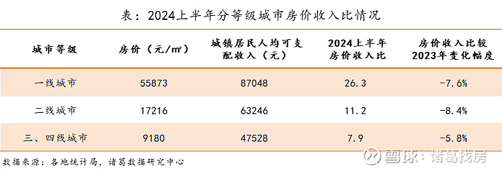 2、2024上半年各线城市房价收入比继续全降,二线城市降幅仍然最大。数据显示,一线城市房价收入比为26.3,较2023年下降7.6%;二线城市房价收入比为11.2,较2023年下降8.4%;三四线城市房价收入比为7.9,较2023年下降5.8%。