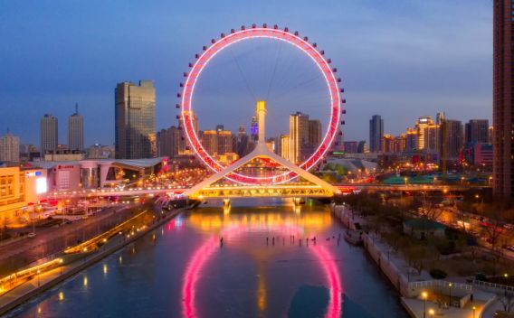 “天津之眼”摩天轮坐落于朱棣率千军万马渡河之处——永乐桥上,是世界唯一一座跨河建筑、桥轮合一的摩天轮,兼具观光和交通功能。