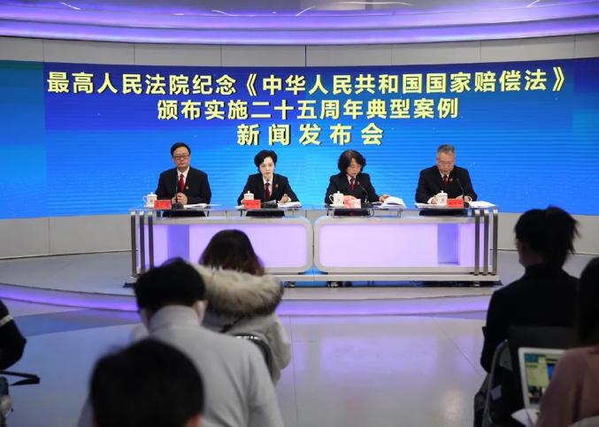 12月29日,最高人民法院举行纪念活动之二——纪念《中华人民共和国国家赔偿法》颁布实施二十五周年典型案例新闻发布会,发布最高人民法院评选出的二十五年来各级人民法院审结的25件国家赔偿典型案例。最高人民法院副院长、赔偿委员会主任委员陶凯元,最高人民法院赔偿办主任、赔偿委员会副主任委员刘竹梅,最高人民法院赔偿办副主任祝二军出席发布会并介绍相关情况,最高人民法院新闻发言人李广宇主持发布会。