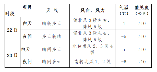 预计22日中午到23日中午,琼州海峡多云间阴天,有零星小雨,风力5级、阵风6~7级,通航气象条件总体良好。