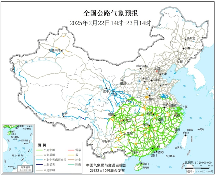 图3  全国公路气象预报图(2月22日14时至23日14时)