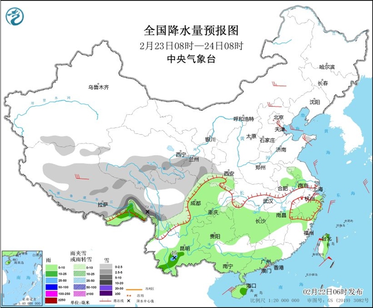 图1 全国降水量预报图(2月22日14时-23日08时)