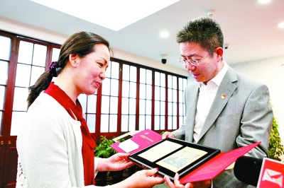 5月5日,中共一大会址纪念馆副馆长徐明(右)向观众赠送纪念馆馆藏《共产党宣言》的复制件。新华社发