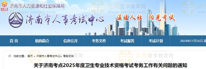 根据卫生专业技术资格考试办公室《关于2025年度卫生专业技术资格考试有关问题的通知》(卫考办发〔2024〕1号)、《国家卫生健康委人才交流服务中心关于2025年度卫生专业技术资格考试考务工作安排的通知》(卫人才发〔2024〕81号)、山东省人事考试中心《关于2025年度卫生专业技术资格考试考务工作有关问题的通知》精神及有关工作要求,现将济南考点2025年度卫生专业技术资格考试考务工作有关事项通知如下: