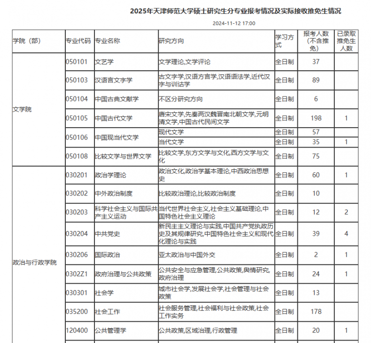 天津师范大学发布2025年天津师范大学硕士研究生分专业报考情况及实际接收推免生情况统计表。