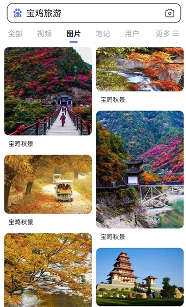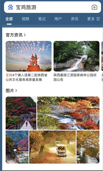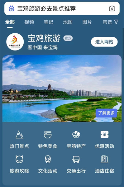 用户只需要打开手机百度APP,搜索“宝鸡旅游”“宝鸡景区”“宝鸡游玩攻略”等高频检索词触发,即可打开“宝鸡旅游”的城市名片,宝鸡的热门景点、特色美食、宝鸡特产、优惠活动、旅游攻略、交通出行、酒店住宿等“吃住行游购娱”信息一览无余。用户根据需求点击进去,即可在图片、视频的生动展示中感受宝鸡市独特的人文风光,掌握宝鸡旅游观光的最强攻略,领略景区景点风貌,了解最新活动咨询和有关优惠政策。同时,链接宝鸡新闻网量身打造的“宝鸡旅游资讯网”,以更加直观展示宝鸡文旅形象。