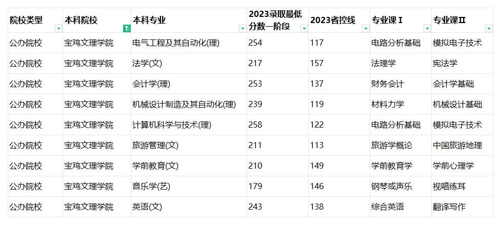 通过以上数据可以知道,2024年宝鸡文理学院专升本招生9个专业,分别是电气工程及其自动化(理)、法学(文)、会计学(理)、机械设计制造及其自动化(理)、计算机科学与技术(理)、旅游管理(文)、学前教育(文)、音乐学(艺)、英语(文)。各专业考试科目请参看上表。