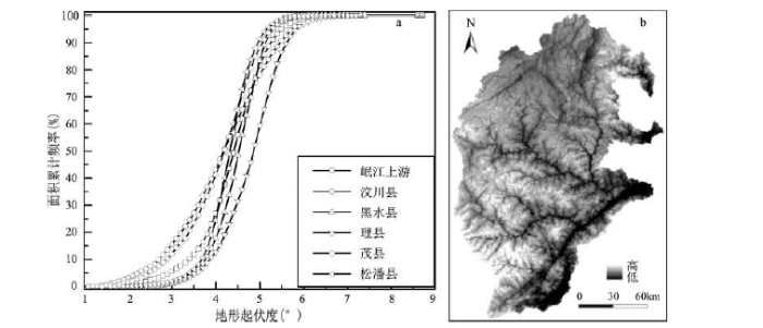 3 结果分析 3.1 地形起伏度特征从整体看,岷江上游地形起伏度以高值为主。地形起伏度的最低值为1.1°,大部分区域地形起伏度值域介于4~6°之间,当地形起伏度等于2°时,累计频率为0.85%,当地形起伏度从3°增加至4°时,累积频率增加显著,从5.53%增长至26.95%,当地形起伏度从4°增加至5°时,累积频率增幅到达最大,从26.95%增长至81.62%,地形起伏度达到6°时,累计频率为98.91%(a)。