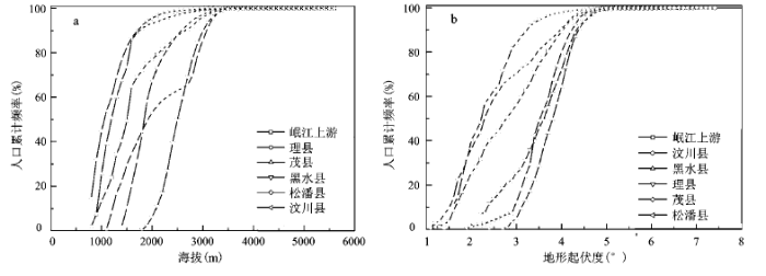 Fig.4 Accumulative population frequencies with different elevation(a) and RDLS(b) in the upper Minjiang River Basin