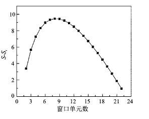 ... 1)最佳统计单元计算.地形起伏度(relief degree of land surface)也称地势起伏度、相对地势或相对高度,是指某一确定面积内最高和最低点之高差.可反映宏观区域地表起伏特征,是定量描述地貌形态、划分地貌类型的重要指标.随着某一个范围的增大,地势起伏度必然会增加,因此地形起伏度研究的关键是确定最佳统计单元,根据前人的研究得出地形起伏度随面积的变化曲线呈逻辑斯蒂曲线,最佳统计单元的大小确定即在此曲线由陡变缓处.本文应用均值变点分析法计算最佳统计单元[12,13].令数据序列{xi}中i= 1,2…N,样本分为x1,x2,…xi-1和xi,xi+ 1…xN两段,计算每段样本的算术平均值Xi1、Xi2及其统计量,及总体样本的离差平方和S及分段样本的离差平方和之差Si.其中 , .根据王玲等方法处理数据得出[3],统计量S=12.94,对S-Si数据序列按照均值变点分析法进行计算可得到差值变化曲线(图1),在第7个点时S与Si的差值达到了最大,这一点即我们寻找的变点,第7个点对应的分析窗口为15×15像元,通过均值变点分析法确定地形起伏度的最佳统计单元为0.81 km2. ...