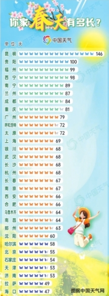有趣的是,入春早的城市春日未必长,入春晚的也不一定短。从各地春季长度统计来看,每年第一批入春的海口却是春日最短暂的大城市,春日仅有47天,这里纬度低,冷空气影响小,入春早、入夏也早,春天长度被严重压缩。而入春最晚的西宁,由于地处青藏高原,海拔高,通常没有夏季,随着气候变暖,偶尔有几个晚来的夏日,平均春季长度可达98天,位列大城市春日排行榜第四位。