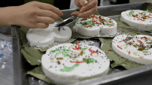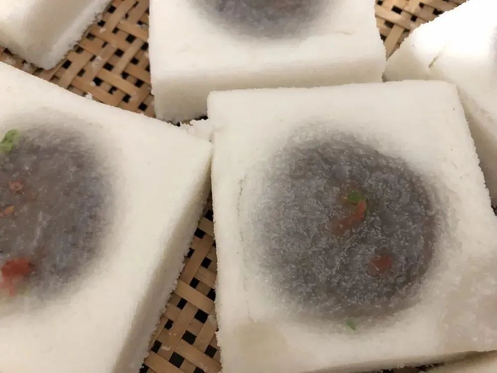 奉贤方糕是蒸成16块小方糕,而七宝方糕则是一大块成型。相比奉贤方糕,七宝方糕的生坯制作少了三道工序,但馅料丰富得多,不仅有豆沙,还有枣泥、芝麻等。