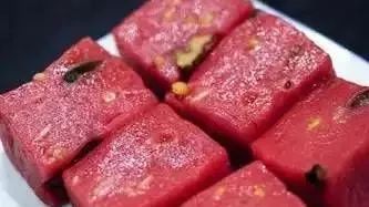 蜜糕里有蜜枣丁、核桃丁、松子仁、瓜子仁等等,果料香甜,色如玫瑰。因为颜色喜气也叫喜糕,吃一块也是让人身心欢喜。