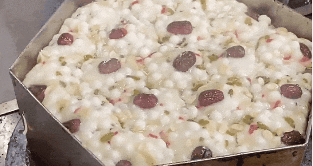 常年制作年糕团的阿姐说,最正宗年糕团的是大米发出来的,而不是糯米,而且咸菜都是现炒、现包、现卖的。用大米制作而成的糕团压扁放上芝麻等磨的粉,加入现场炒熟的咸菜豆干,最后放入油条包好,口感又糯又香。