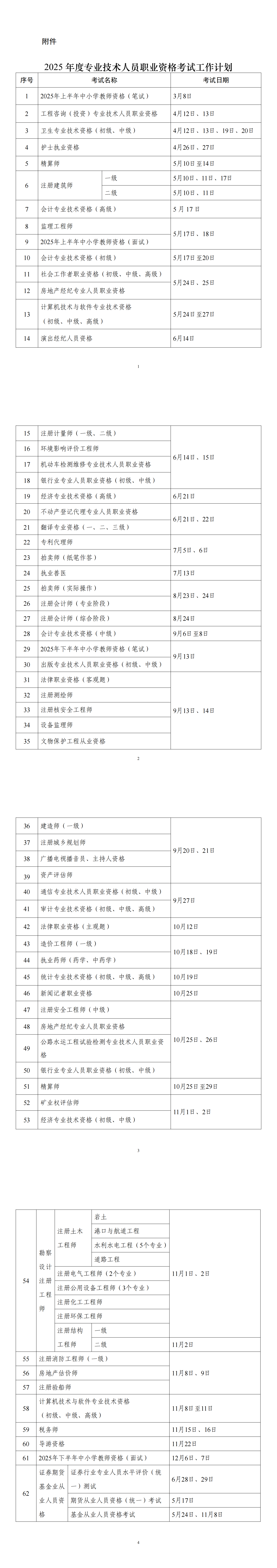 为做好专业技术人员职业资格考试规划和管理工作,便于广大专业技术人员参加职业资格考试,经商有关部门同意,现就2025年度专业技术人员职业资格考试工作计划及有关事项通知如下: