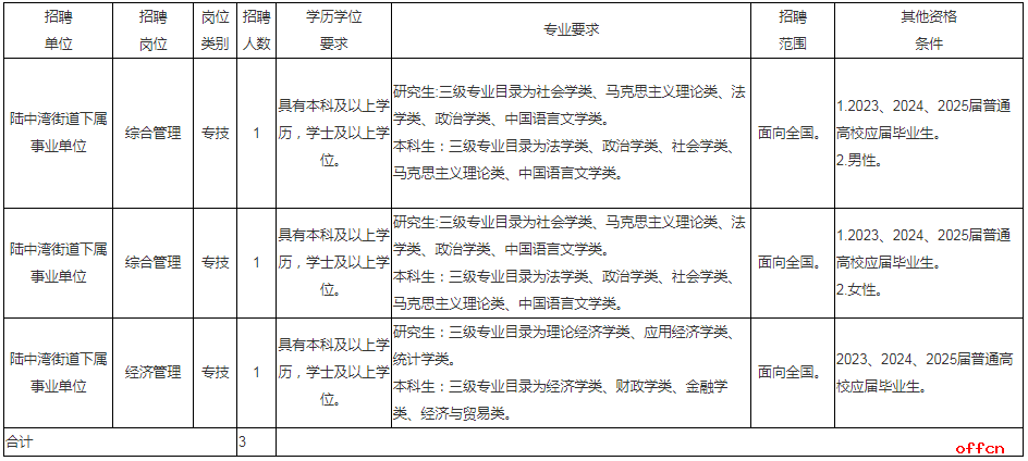 根据《宁波市公开招聘工作人员实施办法》的有关规定,经宁波前湾新区人力资源和社会局同意,宁波前湾新区委托管理街道陆中湾街道下属事业单位决定面向社会公开招聘事业编制工作人员3名。现就有关事项公告如下: