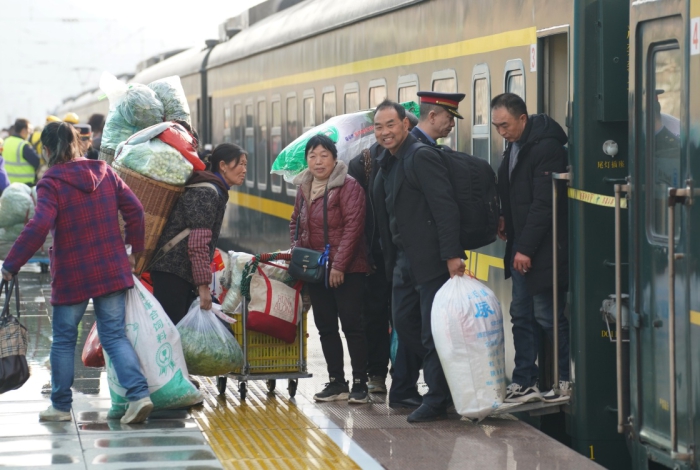 2月17日,在位于陕西汉中市的阳平关站,乘客从6064次列车上下车。新华社记者邵瑞 摄