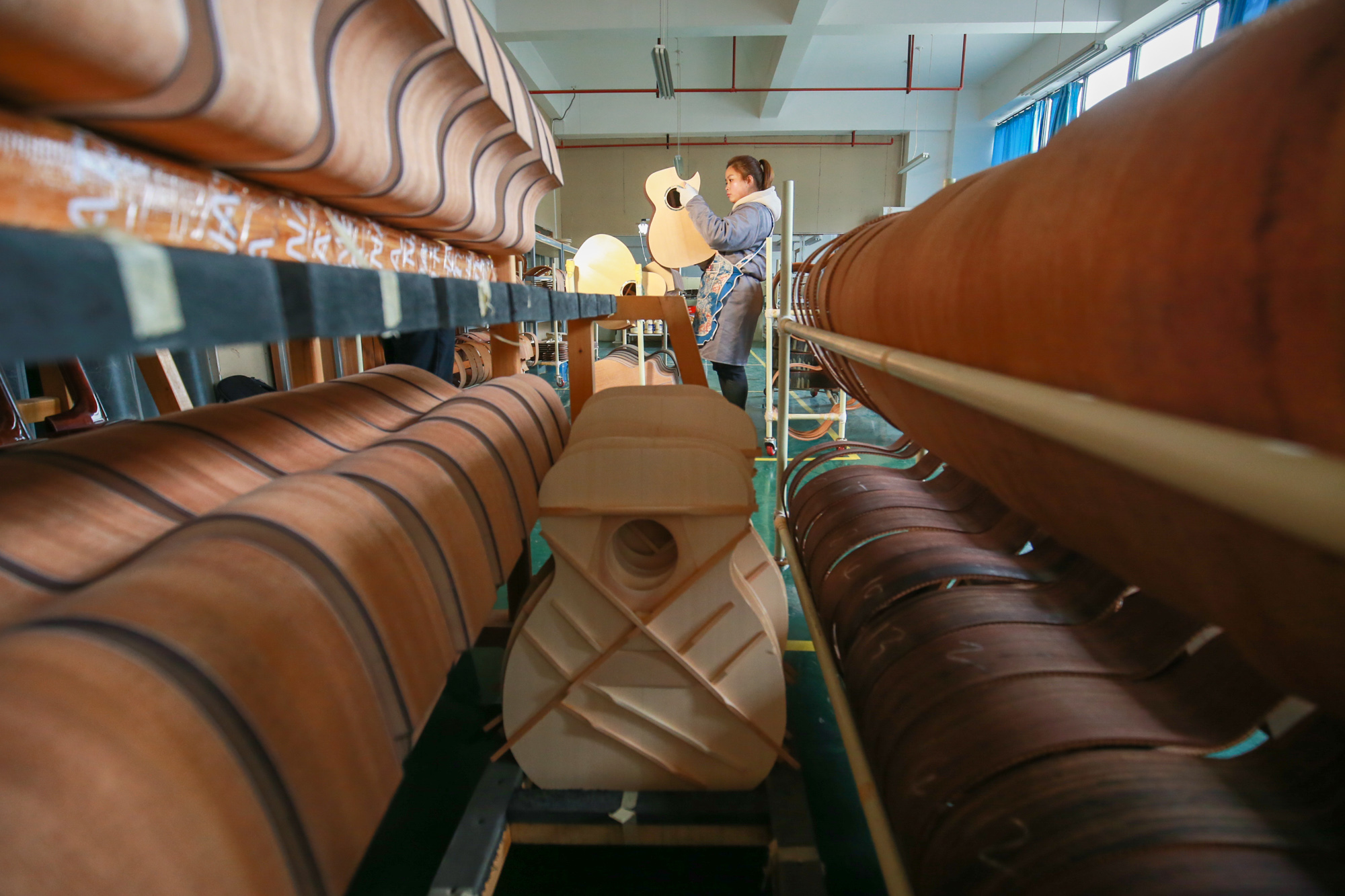 正安吉他产业园一家吉他制造厂工作人员查看产品质量。王纯亮摄(贵州图片库发)