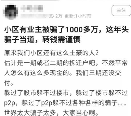 “小区有业主被骗了1000多万元!”昨天上午,杭州某论坛上,一则帖子惊到了很多人。帖子里说杭州城东某小区的住户,被骗了1000多万元。