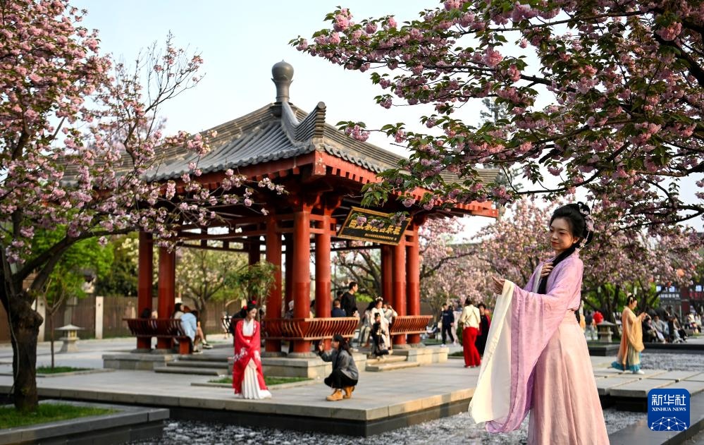 游客在西安曲江大雁塔文化休闲景区赏花留影(2024年4月8日摄)。