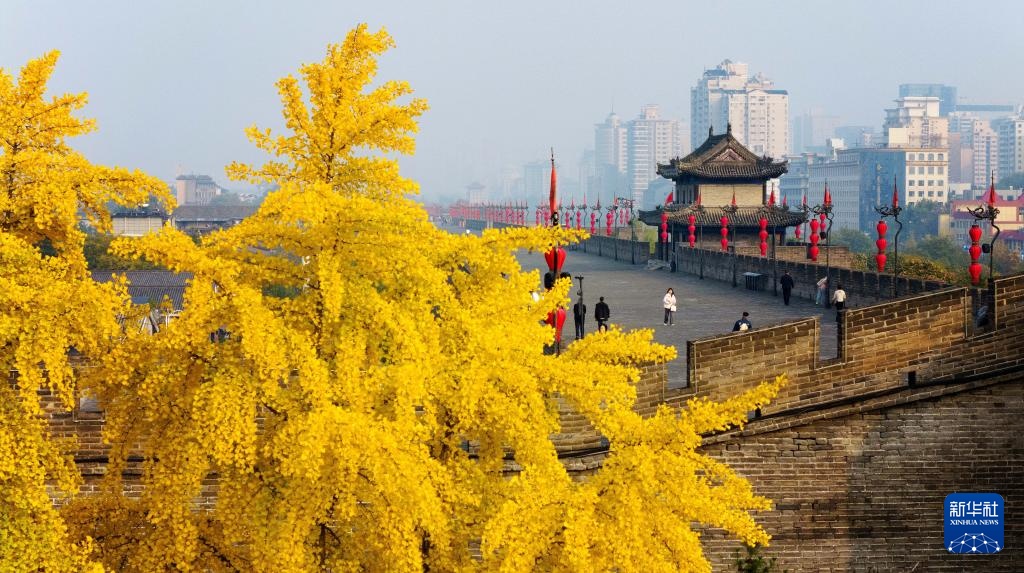 游客在西安城墙上散步(无人机照片,2024年11月6日摄)。