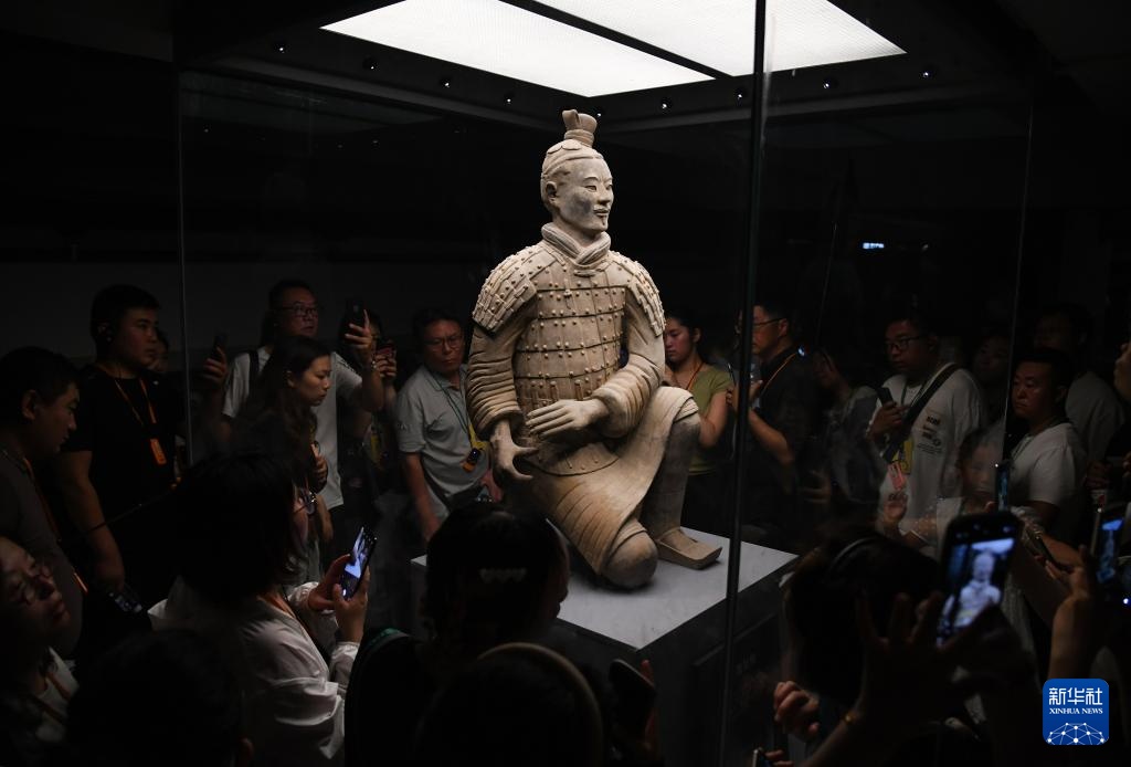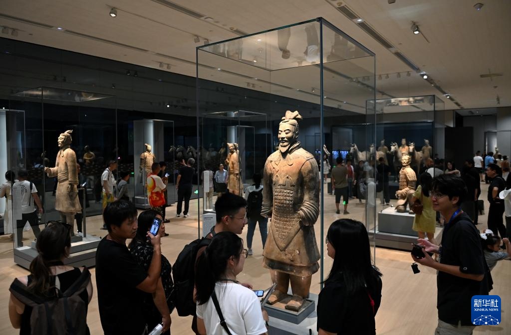 观众在秦始皇帝陵博物院观看“千古一帝的地下王国——秦始皇陵考古发现展”上展出的兵马俑(2024年9月8日摄)。