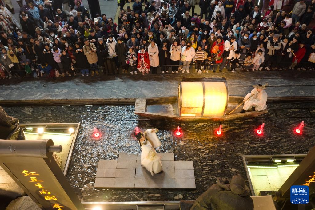 游客在西安大唐不夜城景区观看以唐代历史文化为背景创作的情景剧(无人机照片,2025年1月22日摄)。