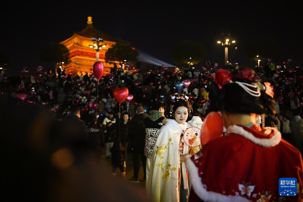 身着传统服饰的游客在西安钟楼拍照,迎接新年的到来(2024年12月31日摄)。